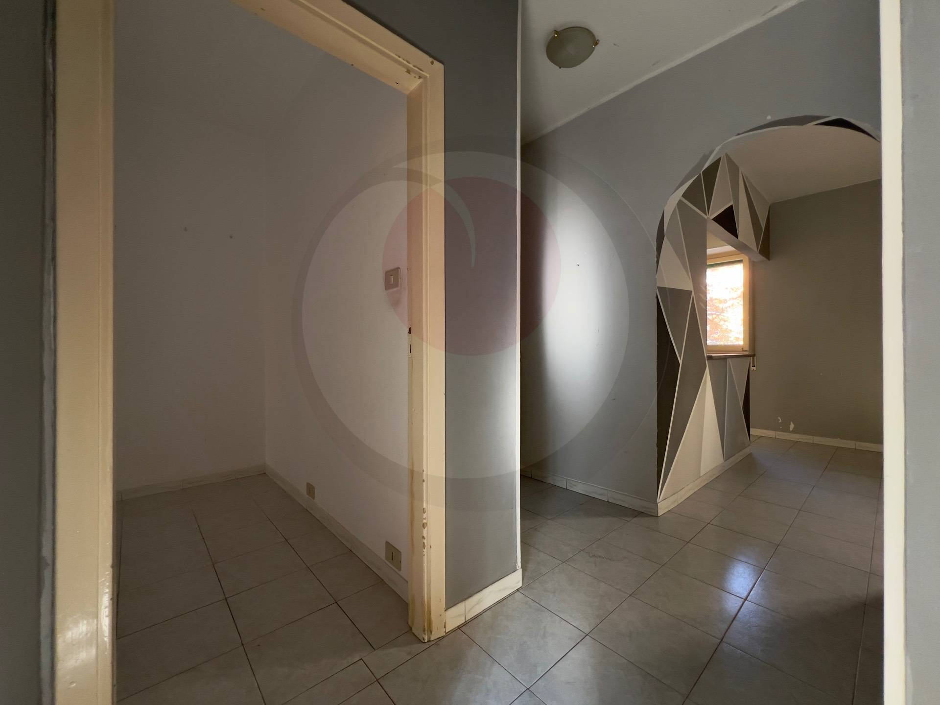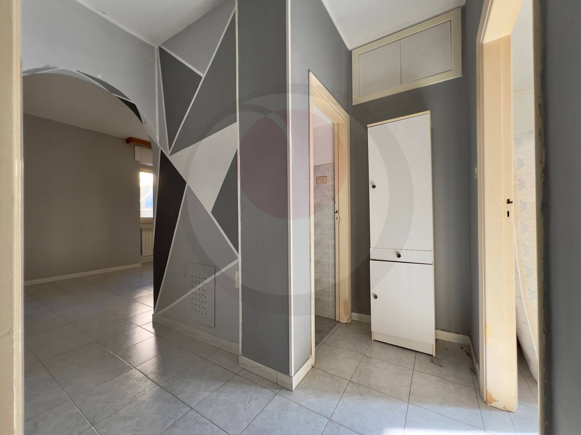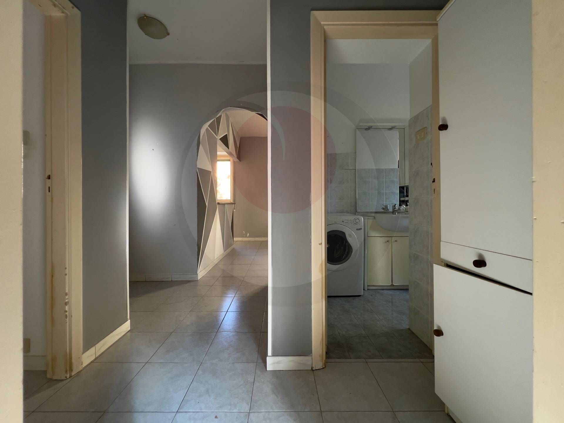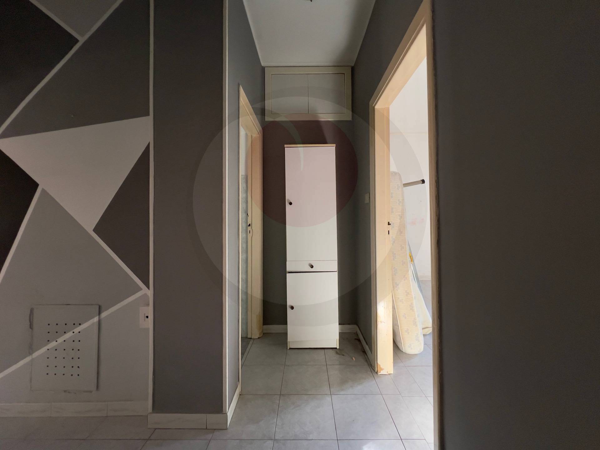 Ingresso su disimpegno, zona giorno con cucina a vista, due camere matrimoniali e servizio con box doccia.