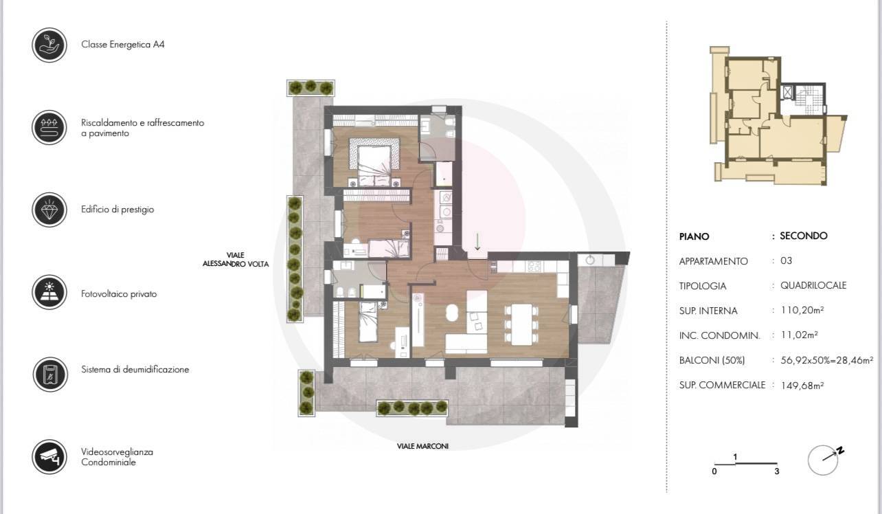 Infatti, grazie a tecnologie all'avanguardia, come impianti fotovoltaici e sistemi di isolamento termico e acustico di ultima generazione, riscaldamento e raffreddamento a pavimento, sistemi di deumidificazione e infissi ad alta efficienza, che permettono di raggiungere un'altissima qualità dell'aria, "Marconi18" minimizza i consumi energetici e riduce l'impatto ambientale, garantendo dunque anche un significativo risparmio economico per chi vi abita.