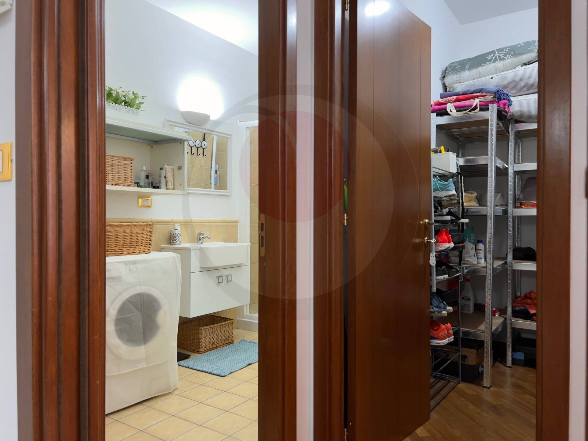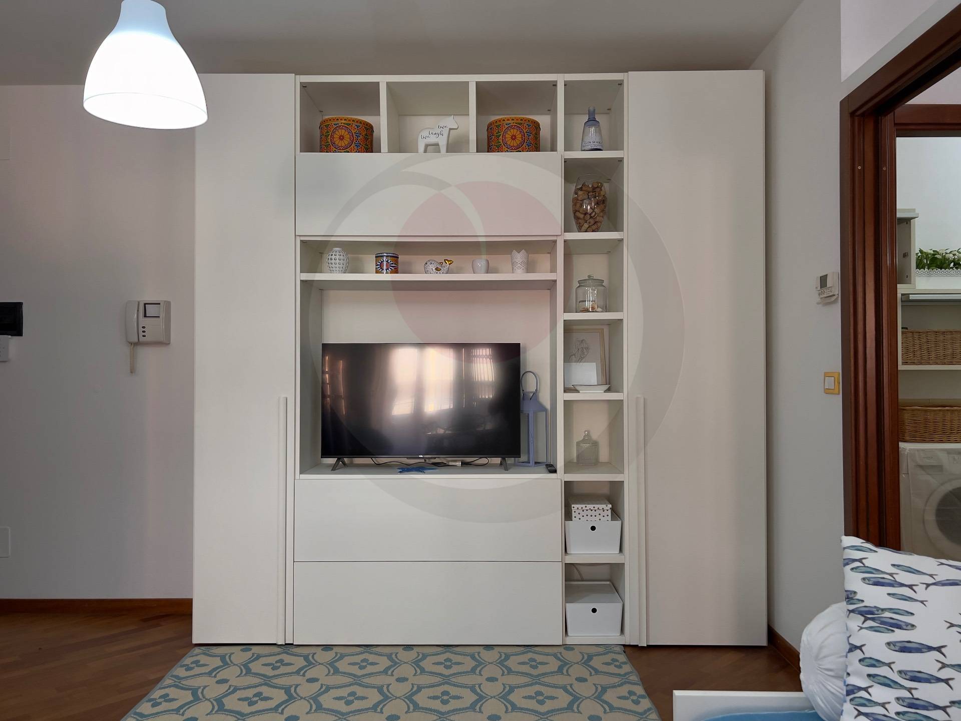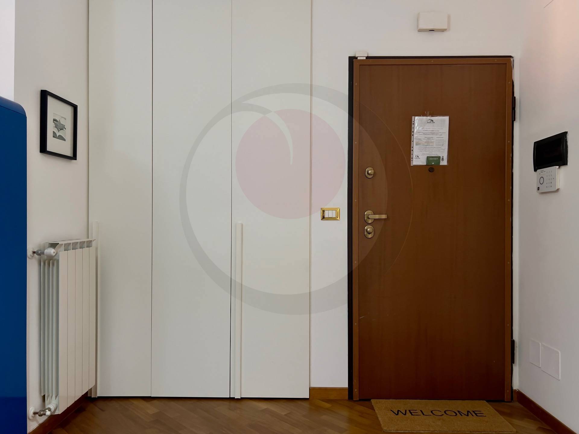 Ingresso su luminosa zona giorno con ampio guardaroba e cucina a vista, ben illuminata da una comoda porta finestra con affaccio su balcone.