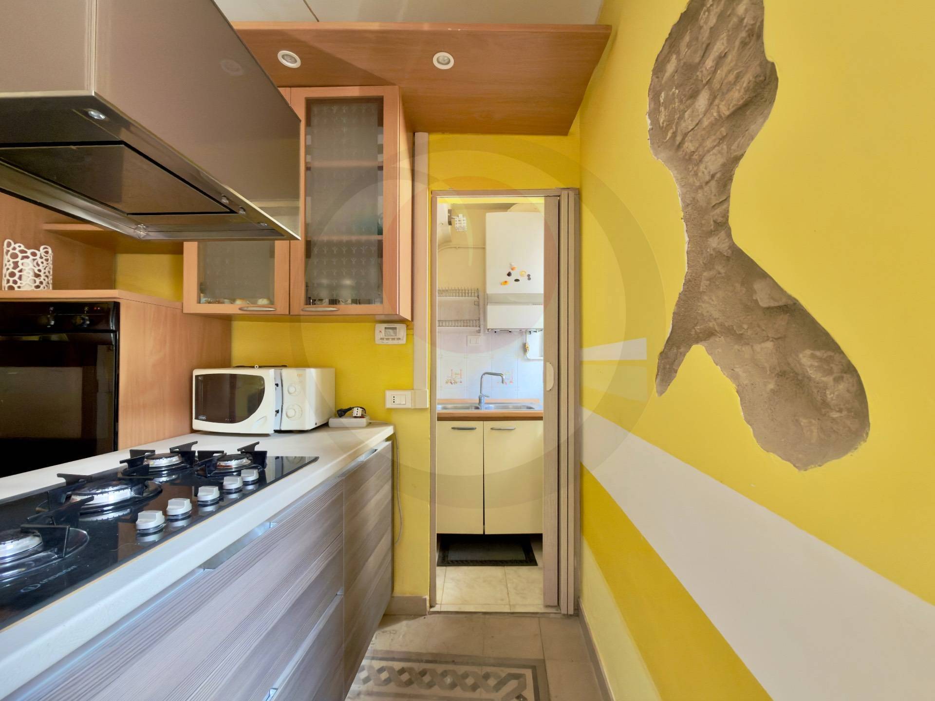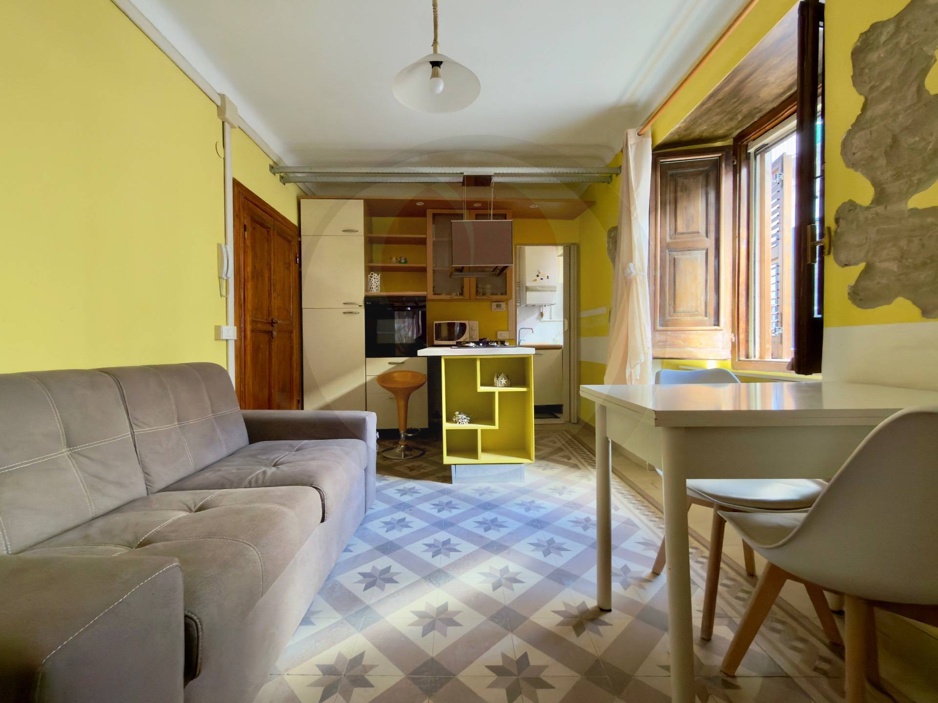 Ingresso su luminosa zona giorno con cucina a vista, camera matrimoniale e servizio con vasca.
